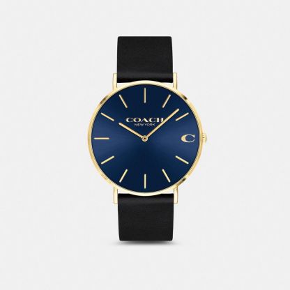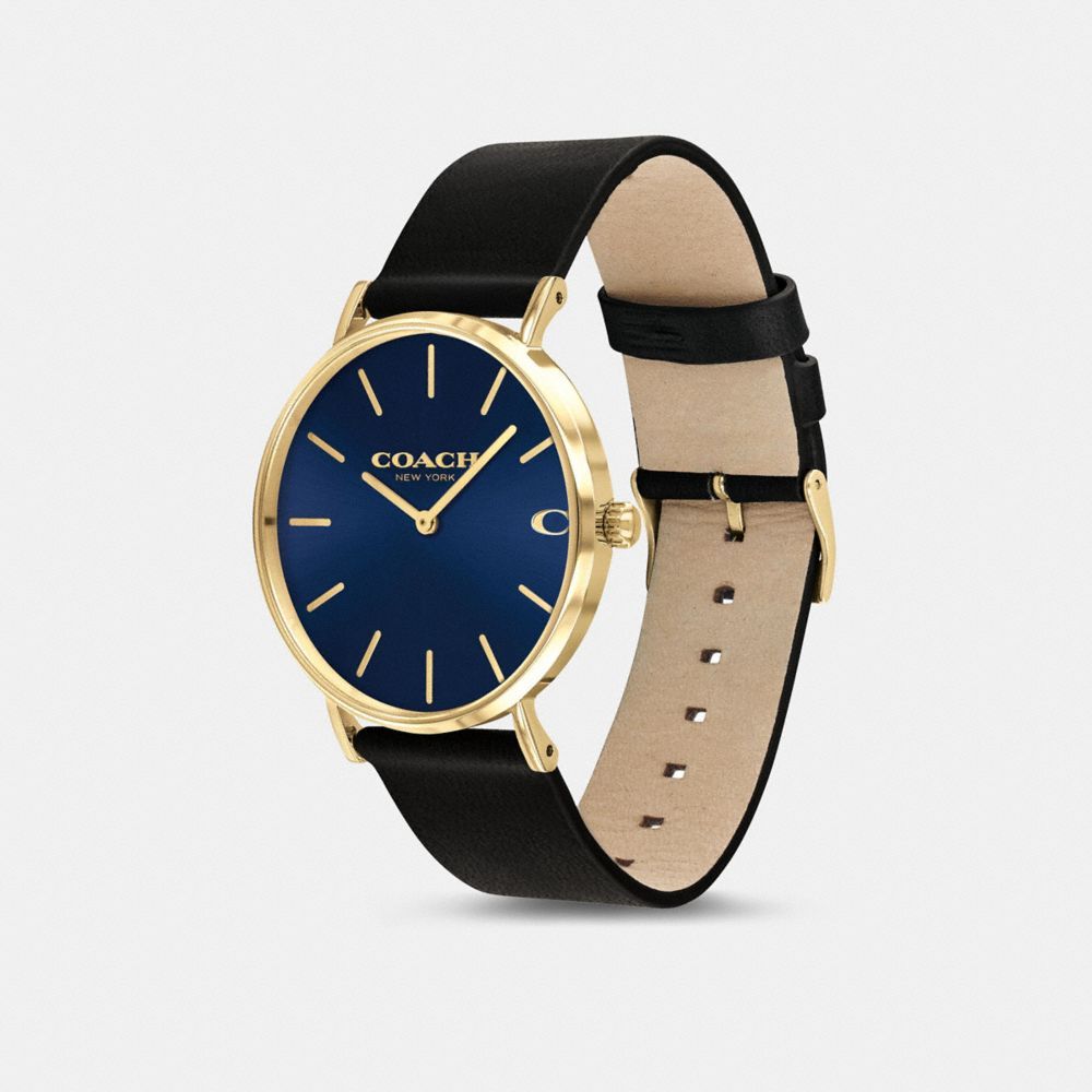 Gold tone case and black leather strap