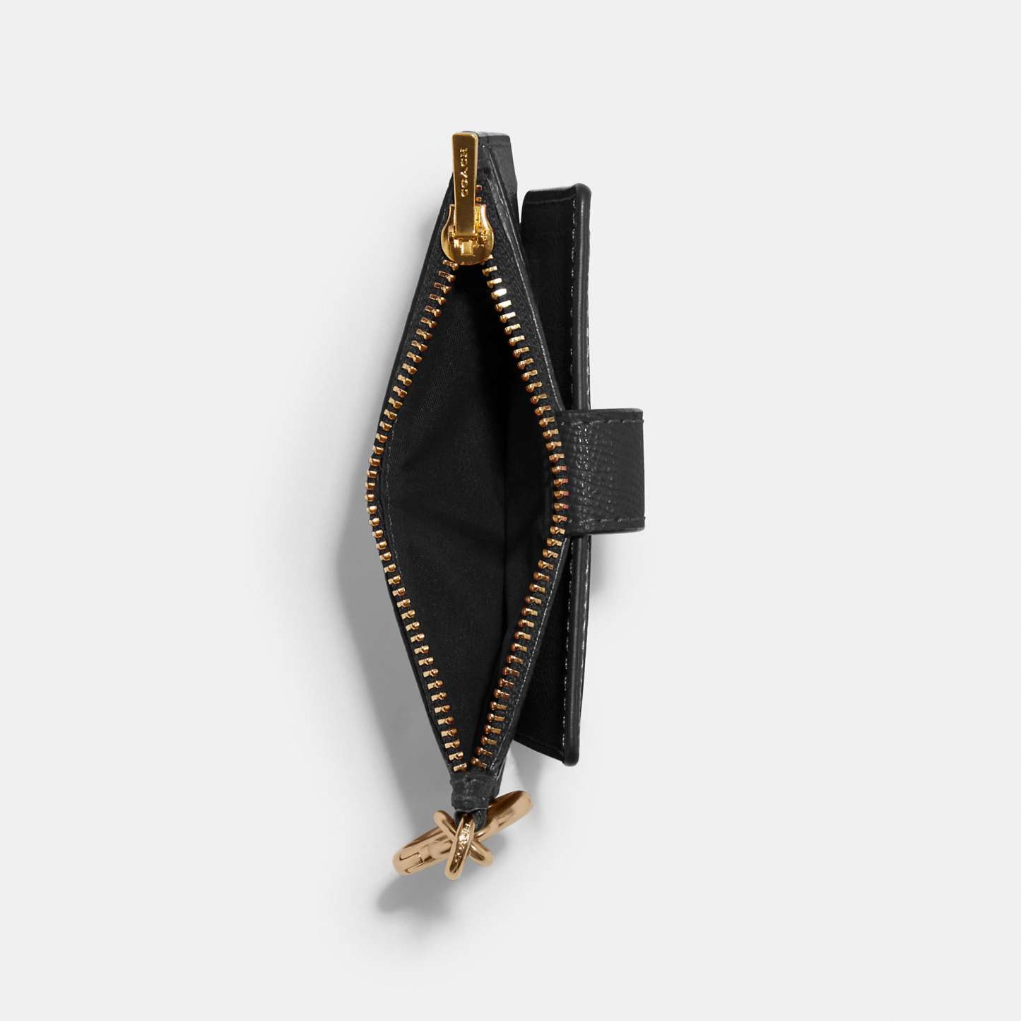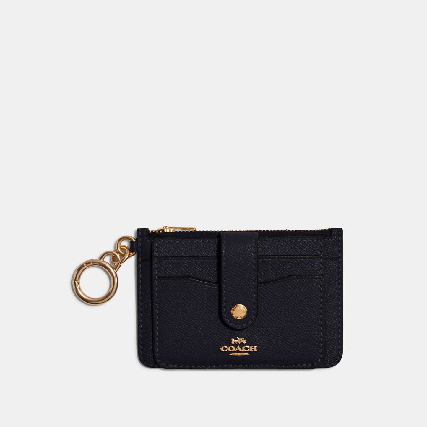 Crossgrain leather Three credit card slots ID window Snap closure Zip compartment Attached hinged key ring 4 3/4 (L) x 3 (H) Style No. C6881 | Outlet Attachment Card Case - Black