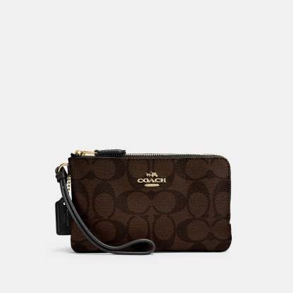 Signature coated canvas Two credit card slots Double zip closure fabric lining Wrist strap attached 6 1/2 (L) x 3 3/4 (H) Fits an iPhone or Android Style No. F87591