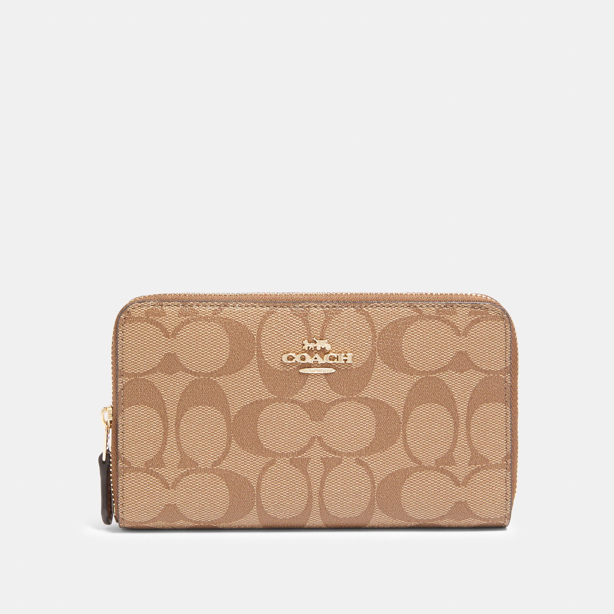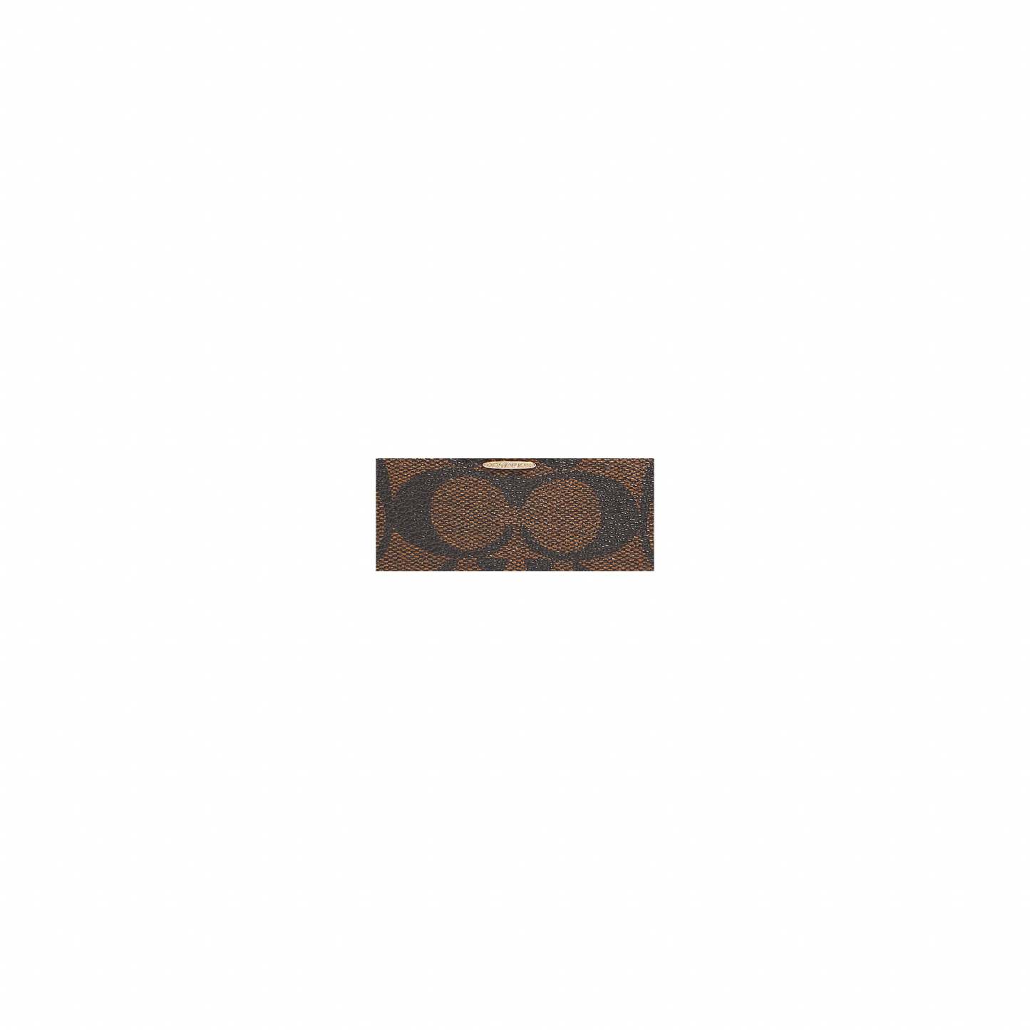 Signature coated canvas Eight credit card slots Bill compartments ID window Zip coin pocket Zip-around closure 6 1/2 (L) x 3 3/4 (H) x 3/4 (W) Style No. F88913