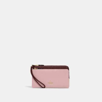 Refined pebble leather Eight credit card slots Inside open pockets Double zip closure fabric lining Wrist strap attached 8 (L) x 4 3/4 (H) x 1 (W) Fits all phone sizes up to an iPhone X and Samsung S7 Edge Style No. CF447