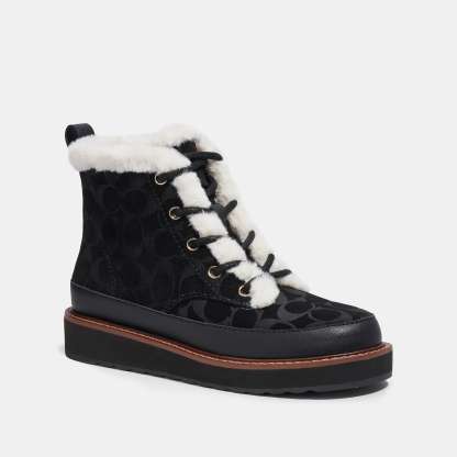 Signature suede and man-made leather upper Faux fur lining and footbed Rubber outsole Lace-up closure Shaft - 4 1/2 height 11 circumference 4 platform Style No. CE325 | Outlet Imani Boot In Signature - Black, Size - 9.5