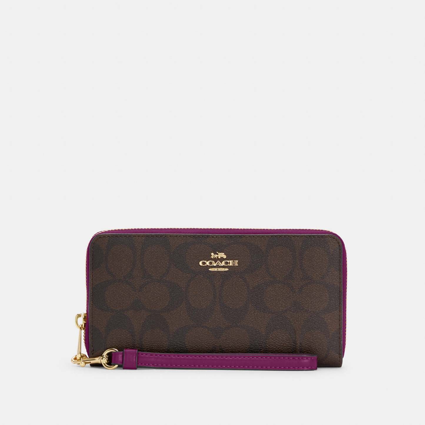 Signature coated canvas and smooth leather Twelve credit card slots Full-length bill compartments Inside zip coin pocket Zip-around closure Detachable wrist strap 7 1/2 (L) x 4 (H) x 1 (W) Fits all iPhone and Samsung Galaxy phones Style No. C4452