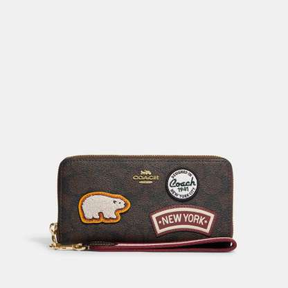 Signature coated canvas and smooth leather Twelve credit card slots Full-length bill compartments Inside zip coin pocket Zip-around closure Detachable wrist strap 7 1/2 (L) x 4 (H) x 1 (W) Fits all iPhone and Samsung Galaxy phones Style No. CE678 | Outlet Long Zip Around Wallet In Signature Canvas With Ski Patches - Multi
