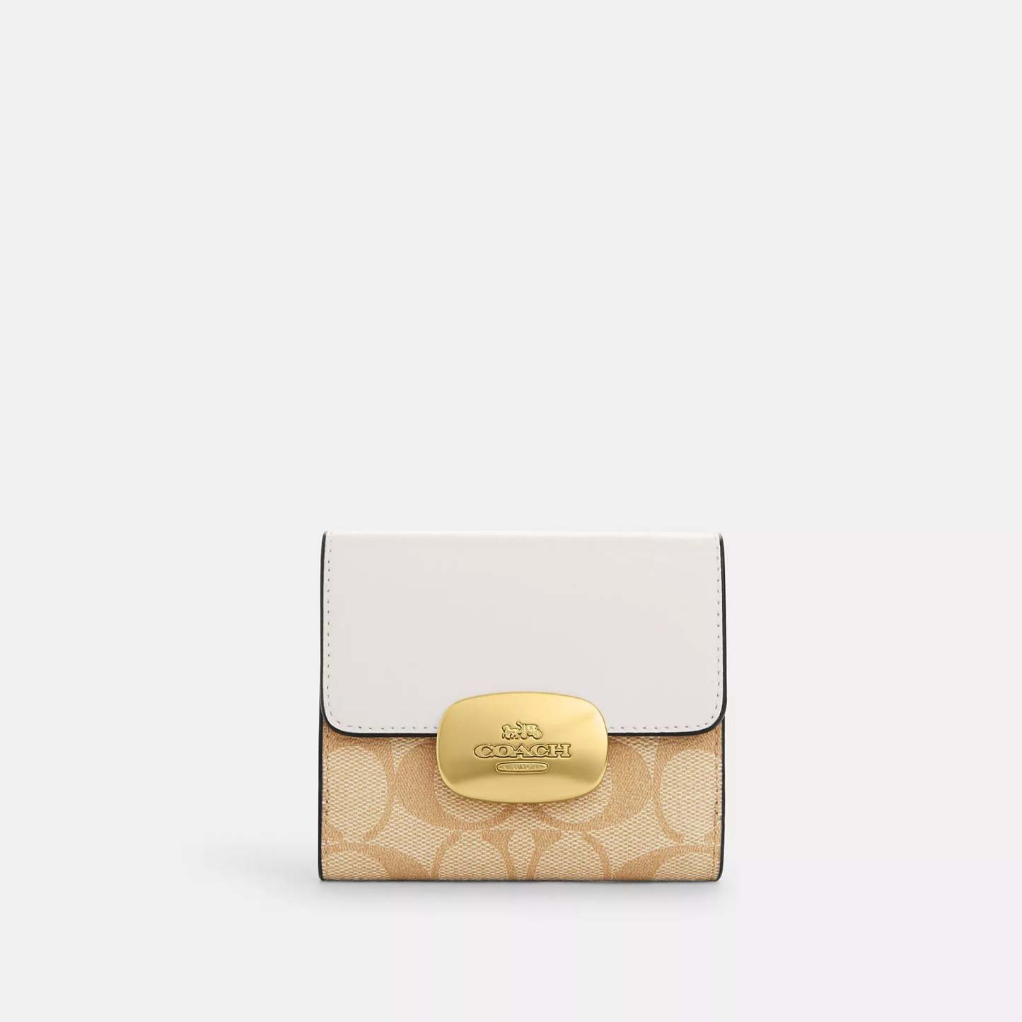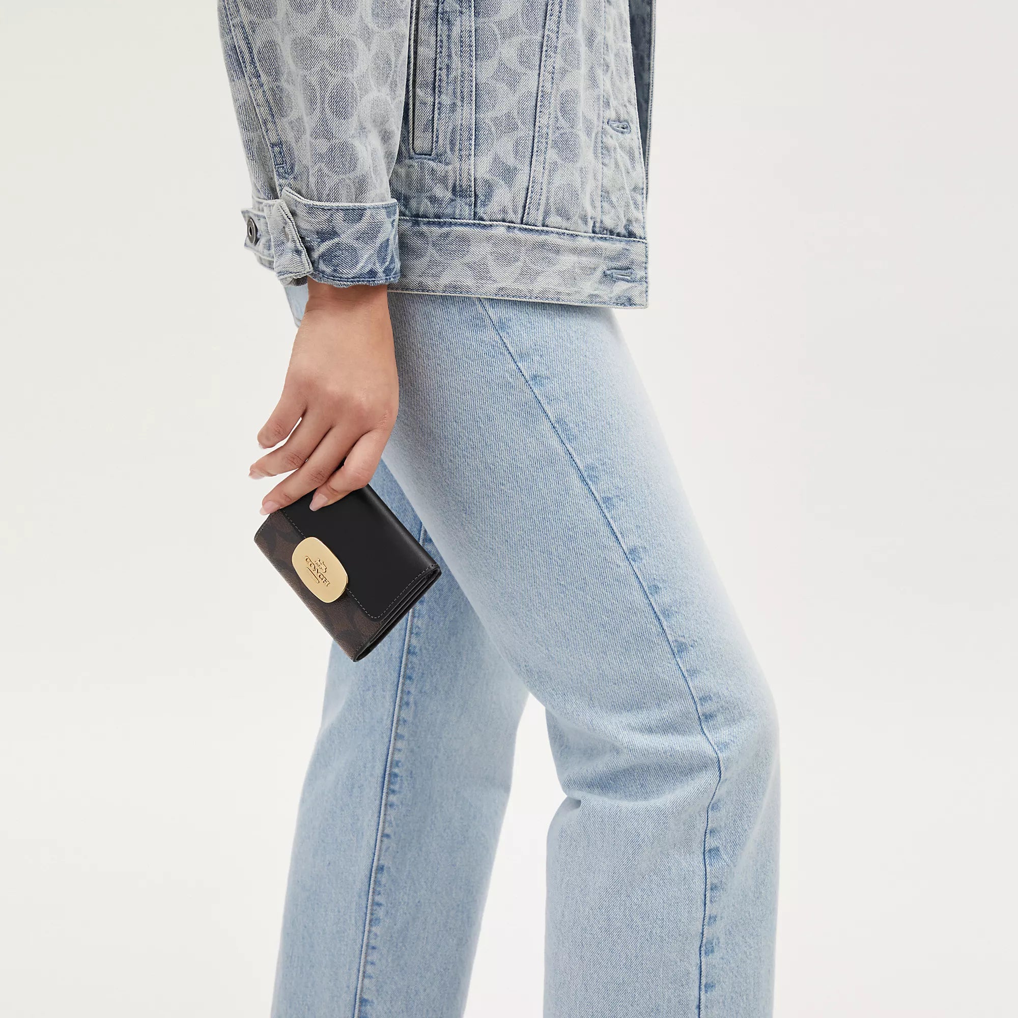 Signature coated canvas and smooth leather Six credit card slots Full-length bill compartment Inside open pockets Snap closures Outside snap coin pocket 4 1/4 (L) x 3 3/4 (H) Style No. CP255 | Outlet Eliza Small Wallet In Signature Canvas - Brown